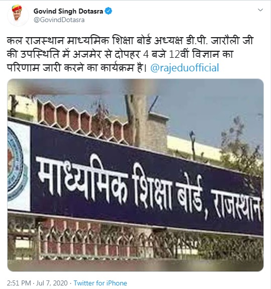 RBSE 12th Science Result 2020 Live Updates @ 4.05 PM: शिक्षा मंत्री और बोर्ड अध्यक्ष की घोषणा
