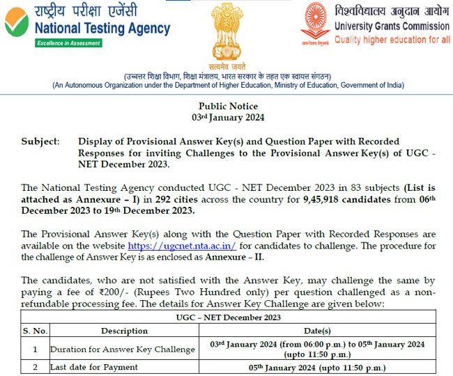 राष्ट्रीय परीक्षा एजेंसी (NTA) ने 9.45 लाख उम्मीदवारों के लिए विश्वविद्यालय अनुदान आयोग (UGC) की तरफ से 83 विषयों में लेक्चररशिप की भर्ती तथा जूनियर रिसर्च फेलोशिप (JRF) प्राप्त करने हेतु पात्रता निर्धारित करने के लिए आयोजित राष्ट्रीय पात्रता परीक्षा (NET) के दिसंबर 2023 सत्र के लिए अनौपचारिक उत्तर-कुंजियां (UGC NET Answer Key December 2023) बुधवार 3 जनवरी 2024 को जारी कर दीं।