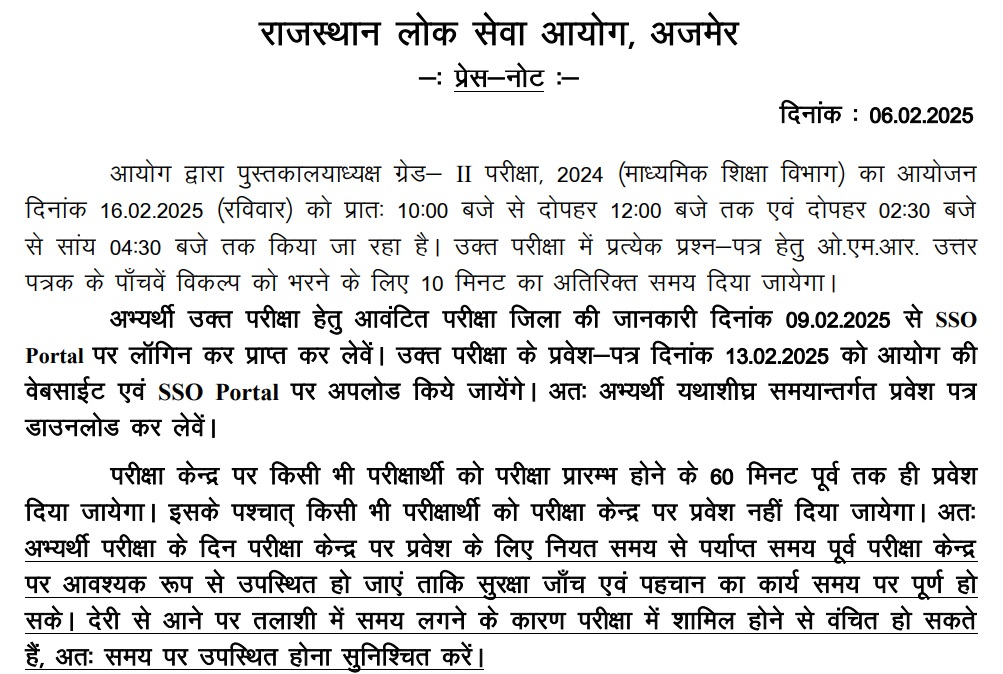 राजस्थान पब्लिक सर्विस कमीशन (RPSC) की ओर से लाइब्रेरियन ग्रेड- II परीक्षा 2024 (माध्यमिक शिक्षा विभाग) का आयोजन 16 फरवरी 2025 को करवाया जायेगा। एग्जाम का आयोजन राज्यभर में निर्धारित परीक्षा केंद्रों पर दो शिफ्ट में करवाया जायेगा। पहली पाली की परीक्षा प्रातः 10 बजे से दोपहर 12 बजे तक एवं दूसरी पाली की परीक्षा दोपहर 2:30 से 4:30 बजे तक आयोजित की जाएगी।