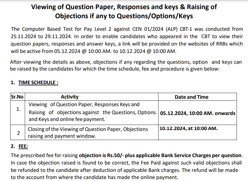 आरआरबी एएलपी प्रोविजनल आंसर की द्वारा अभ्यर्थी अपने सभी प्रश्न उत्तरों का अच्छे से मिलान कर लें। इस दौरान अगर आप इसमें दिए किसी उत्तर से संतुष्ट नहीं हैं तो इस पर ऑब्जेक्शन दर्ज कर सकते हैं। ऑब्जेक्शन विंडो 10 दिसंबर 2024 प्रातः 10 बजे तक खुली रहेगी। ध्यान रखें कि ऑब्जेक्शन दर्ज करने के लिए आपको प्रति प्रश्न के अनुसार 50 रुपये का शुल्क ऑनलाइन माध्यम से जमा करना होगा। अगर आपका दावा सही पाया जाता है तो आपके द्वारा दर्ज किया गया शुल्क बैंक चार्जेज कट करके रिफंड कर दिया जाएगा।