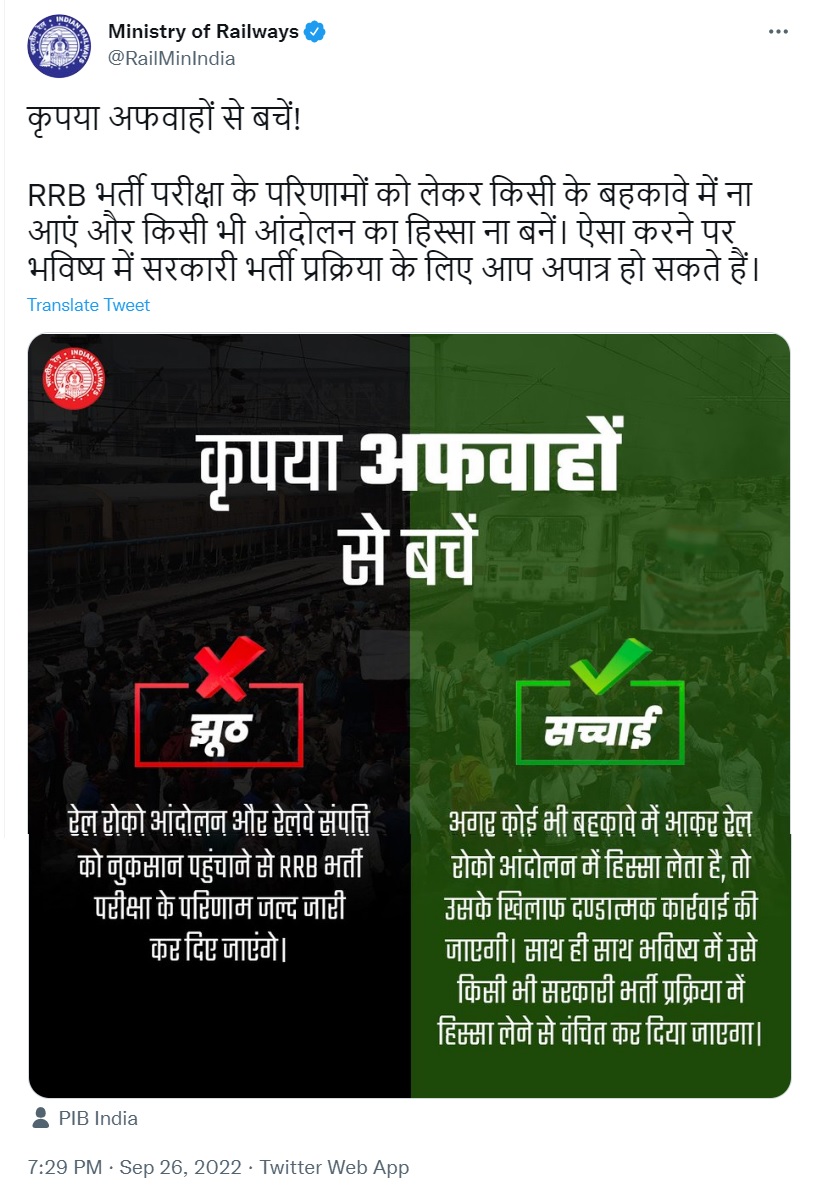 इसके साथ ही, रेल मंत्रालय ने उम्मीदवारों को अफवाहों से बचने की सलाह दी है। मंत्रालय ने इस दावे को झूठा बताया कि रेल रोको आंदोलन और रेलवे संपत्ति को नुकसान पहुचाने से RRB भर्ती परीक्षा परिणाम जल्द जारी कर दिए जाएंगे। वहीं, स्थिति को स्पष्ट करते हुए मंत्रालय की तरफ से घोषणा की गई, “अगर कोई भी बहकावे में आकर रेल रोको आंदोलन में हिस्सा लेता है, तो उसके खिलाफ दण्डात्मक कार्रवाई की जाएगी। साथ ही साथ भविष्य में उसे किसी सरकारी भर्ती प्रक्रिया में हिस्सा लेने से वंचित कर दिया जाएगा”
