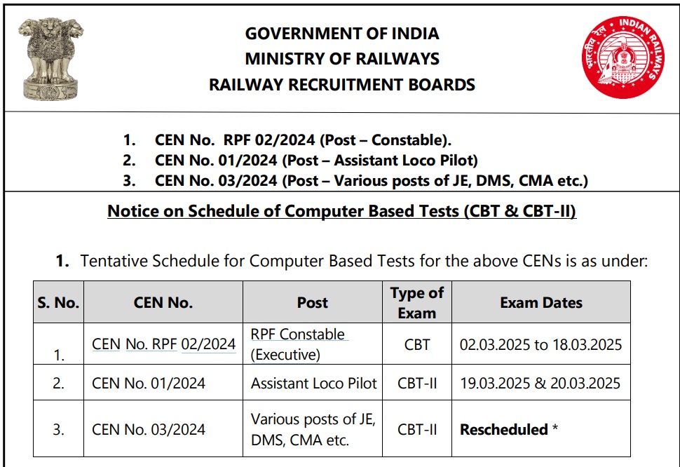 नोटिफिकेशन के मुताबिक अब 19 एवं 20 मार्च 2025 को CEN No. 01/2024 Assistant Loco Pilot CBT-II एग्जाम का आयोजन किया जायेगा। इसके अलावा CEN No. RPF 02/2024 RPF Constable (Executive) का आयोजन 2 से लेकर 20 मार्च 2025 तक करवाया जायेगा।