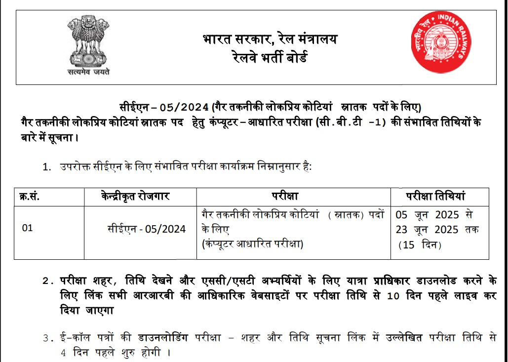 RRB NTPC Exam Date 2025: आरआरबी एनटीपीसी ग्रेजुएट लेवल सीबीटी-1 एग्जाम डेट्स घोषित, 5 से 23 जून तक आयोजित होगी परीक्षा