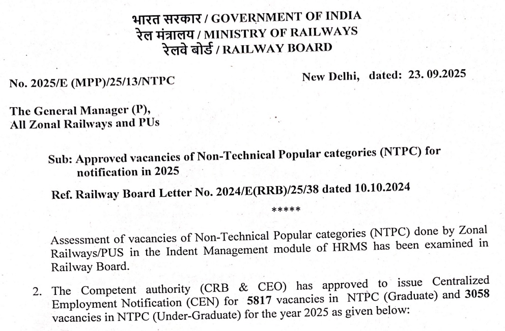 RRB NTPC Vacancy 2025: आरआरबी एनटीपीसी भर्ती के लिए शॉर्ट नोटिफिकेशन जारी, 8875 पदों पर आवेदन जल्द होंगे स्टार्ट