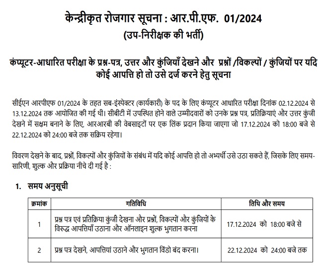RRB RPF SI Answer key OUT: आरआरबी आरपीएफ एसआई भर्ती परीक्षा के लिए आंसर की जारी, 22 दिसंबर तक आपत्ति दर्ज करने का मौका
