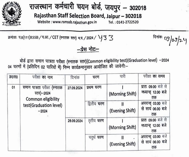 एजुकेशन डेस्क, नई दिल्ली। राजस्थान कर्मचारी चयन बोर्ड (RSMSSB) द्वारा राजस्थान समान पात्रता परीक्षा (ग्रेजुएट लेवल) एग्जामिनेशन 2024 का आयोजन 27 एवं 28 सितंबर 2024 को राज्यभर में निर्धारित परीक्षा केंद्रों पर दो शिफ्ट में संपन्न करवाया जाएगा। इस एग्जाम में आवेदन करने वाले उम्मीदवारों के एडमिट कार्ड आज डाउनलोड के लिए उपलब्ध करवा दिए जाएंगे।