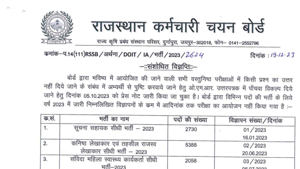 एजुकेशन डेस्क, नई दिल्ली। राजस्थान कर्मचारी चयन बोर्ड (RSMSSB) ने आगामी भर्ती परीक्षाओं के संबंध में अहम नोटिस जारी किया है। इसके मुताबिक, संविदा नर्स भर्ती, सूचना सहायक भर्ती, कनिष्ठ लेखाकार एवं तहसील राजस्व लेखाकार सीधी भर्ती, संविदा महिला स्वास्थ्य कार्यकर्ता सीधी भर्ती, पशु परिचर भर्ती सहित अन्य पदों के लिए आयोजित होने वाली परीक्षा के लिए ओएमआर शीट में पांचवां विकल्प लागू किया जाएगा।