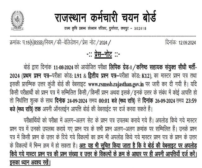 एजुकेशन डेस्क, नई दिल्ली। राजस्थान स्टाफ सिलेक्शन बोर्ड (RSMSSB) की ओर से क्लर्क एवं जूनियर असिस्टेंट पदों पर भर्ती परीक्षा का आयोजन 11 अगस्त 2024 को राज्यभर में निर्धारित परीक्षा केंद्रों पर करवाया गया था। अब एग्जाम में भाग लेने वाले उम्मीदवारों के लिए आरएसएमएसएसबी की ओर से मास्टर प्रश्न पत्र एवं इसकी आंसर की डाउनलोड के लिए उपलब्ध करवा दी गई है।