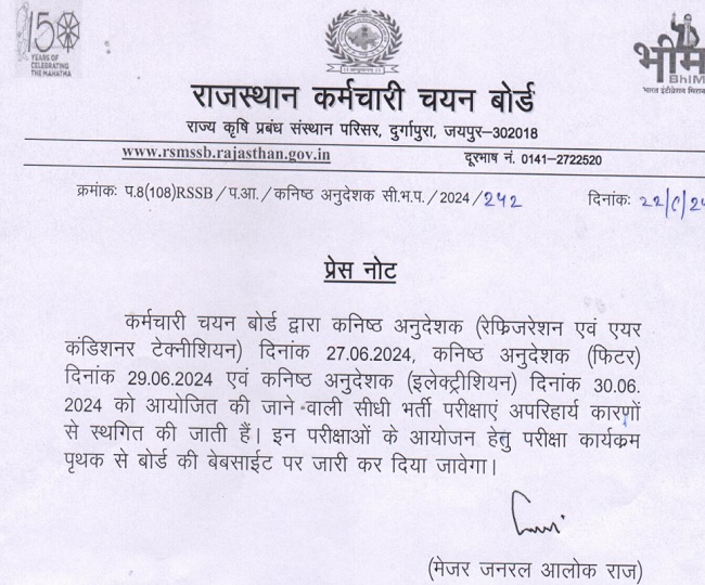 अधिसूचना के मुताबिक यह परीक्षाएं अपरिहार्य कारणों के चलते स्थगित की गई हैं। इन परीक्षाओं हेतु नया शेड्यूल पृथक से बोर्ड की ऑफिशियल वेबसाइट rsmssb.rajasthan.gov.in पर जारी कर दिया जाएगा।
