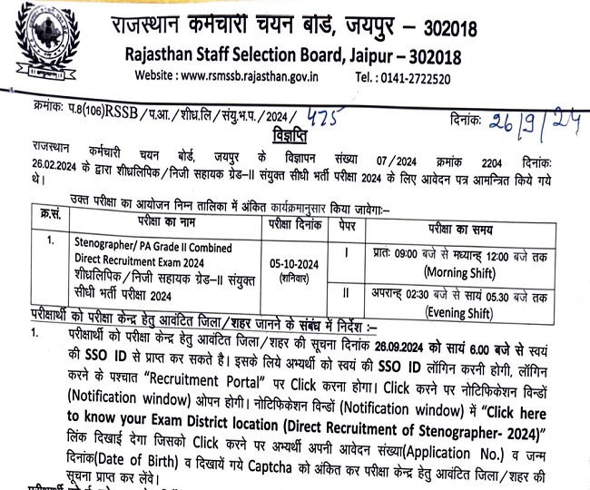 RSMSSB: राजस्थान स्टेनोग्राफर एवं पर्सनल असिस्टेंट भर्ती परीक्षा के लिए एग्जाम सिटी स्लिप जारी, एडमिट कार्ड 30 सितंबर को होंगे उपलब्ध