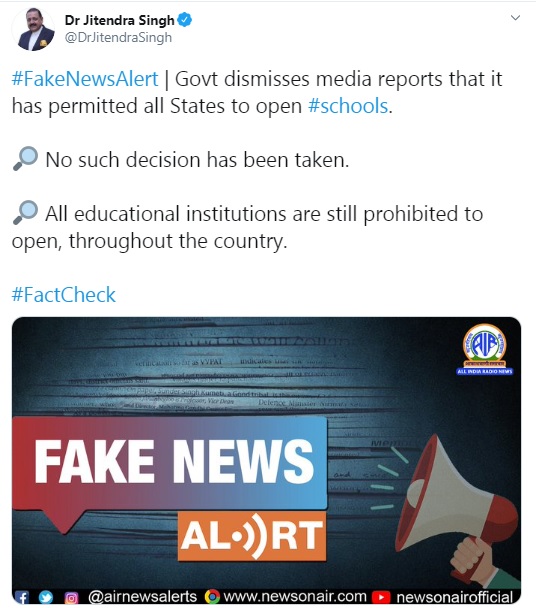 सोशल मीडिया और विभिन्न समाचार वेबसाइट्स पर फैलायी जा रही झूठी अफवाह की खबरों का सरकार ने खंडन किया है। भारत सरकार में प्रधानमंत्री कार्यालय में राज्य मंत्री डॉ. जीतेंद्र सिंह ने आज थोड़ी ही देर पहले जानकारी देते हुए बताया कि सरकार ने स्कूलों के खोलने के बारे में किसी भी प्रकार का निर्णय अभी नहीं लिया है। साथ ही, उन्होंने बताया कि पूरे देश में सभी शिक्षण संस्थानों को खोले जाने को लेकर अभी भी प्रतिबंध लागू है।