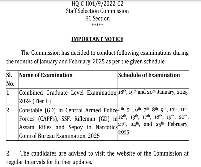 अधिसूचना में दी गई जानकारी के मुताबिक संयुक्त स्नातक स्तरीय परीक्षा Combined Graduate Level Examination, 2024 (Tier II) का आयोजन 18,19 और 20 जनवरी 2025 को देशभर में निर्धारित परीक्षा केंद्रों पर करवाया जाएगा। इसके अलावा केंद्रीय सशस्त्र पुलिस बलों (सीएपीएफ) और असम राइफल्स में राइफलमैन (जीडी) और नारकोटिक्स कंट्रोल ब्यूरो (एनसीबी) में सिपाही (Constable (GD) in Central Armed Police Forces (CAPFs), SSF, Rifleman (GD) in Assam Rifles and Sepoy in Narcotics Control Bureau Examination, 2025) भर्ती परीक्षा का आयोजन 4, 5, 6, 7, 8, 9, 10, 11, 12, 13, 17, 18, 19, 20, 21, 24 और 25 फरवरी 2025 को करवाया जायेगा।