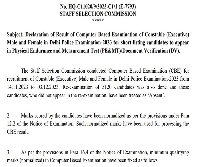 एजुकेशन डेस्क, नई दिल्ली। एसएससी कॉन्स्टेबल (एग्जीक्यूटिव) दिल्ली पुलिस भर्ती के लिए परीक्षा का आयोजन 14 नवंबर से 3 दिसंबर 2023 तक किया गया था। परीक्षा संपन्न होने के बाद अब स्टाफ सिलेक्शन कमीशन (SSC) की ओर से रिजल्ट की घोषणा कर दी गयी है। जिन उम्मीदवारों ने इस भर्ती परीक्षा में भाग लिया था वे तुरंत ही एसएससी की ऑफिशियल वेबसाइट ssc.nic.in पर जाकर या इस पेज पर उपलब्ध करवाए गए डायरेक्ट लिंक चेक कर सकते हैं। रिजल्ट पीडीएफ फॉर्मेट में जारी किया गया है जिसमें सफल उम्मीदवारों के नाम, रोल नंबर आदि डिटेल दर्ज हैं।