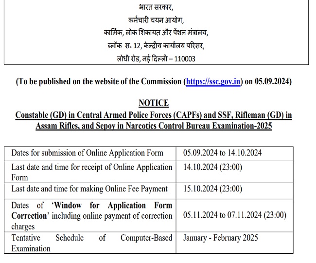 एजुकेशन डेस्क, नई दिल्ली। एसएससी जीडी कॉन्स्टेबल 2025 की तैयारियों में जुटे युवाओं के लिए खुशखबरी है। स्टाफ सिलेक्शन कमीशन (SSC) की ओर से केंद्रीय सशस्त्र पुलिस बलों (CAPFs) और एसएसएफ (SSF) में कांस्टेबल (जीडी), असम राइफल्स में राइफलमैन (जीडी), और नारकोटिक्स कंट्रोल ब्यूरो में सिपाही परीक्षा 2025 के लिए नोटिफिकेशन (SSC GD Notification 2025) जारी कर आवेदन प्रक्रिया शुरू कर दी गई है।