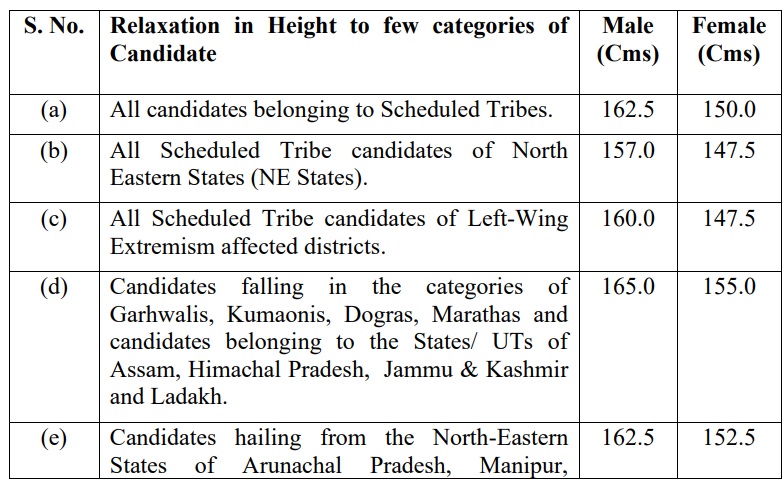 इस भर्ती में शामिल होने के लिए पुरुष उम्मीदवारों की न्यूनतम लंबाई 170 cms और महिला उम्मीदवारों की ऊंचाई 157 cms होनी चाहिए। आरक्षित वर्ग/ क्षेत्र से आने वाले उम्मीदवारों को नियमानुसार छूट दी गई है। वर्ग के अनुसार लंबाई एवं चेस्ट माप की डिटेल नीचे इमेज से चेक कर सकते हैं।