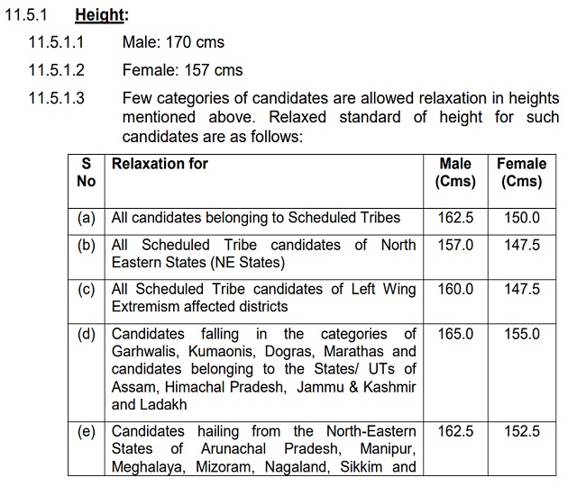 इस भर्ती में शामिल होने के लिए पुरुष अभ्यर्थियों की न्यूनतम लंबाई 170 सेमी होना अनिवार्य है वहीं महिला उम्मीदवारों के लिए न्यूनतम लंबाई 157 सेमी तय की गयी है। शेड्यूल ट्राइव, नार्थ ईस्टर्न स्टेट्स सहित अन्य आरक्षित क्षेत्रों से आने वाले उम्मीदवारों के लिए लंबाई अलग-अलग तय की गयी है।
