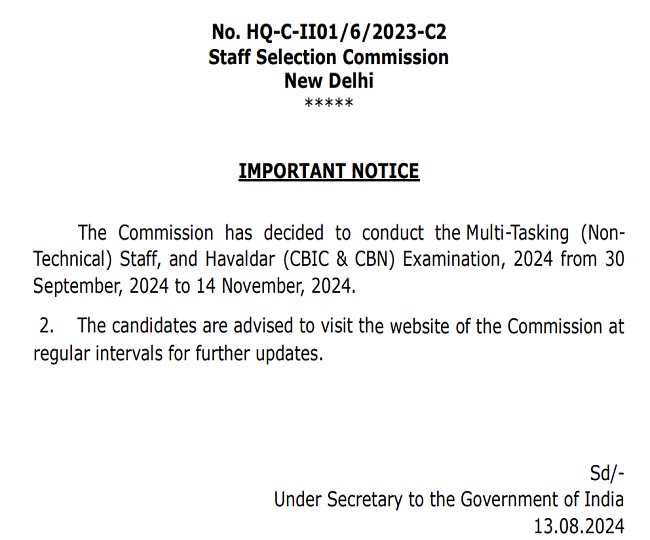 एसएससी की ओर से अधिसूचना में दी गई जानकारी के मुताबिक Multi-Tasking (NonTechnical) Staff, and Havaldar (CBIC & CBN) Examination, 2024 के लिए परीक्षाओं का आयोजन 30 सितंबर से 14 नवंबर 2024 के बीच किया जाएगा। डेट की विस्तृत डिटेल के लिए एसएससी की ओर से समय समय पर वेबसाइट पर विजिट करने की सलाह दी गई है।