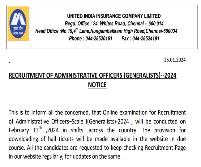 एजुकेशन डेस्क, नई दिल्ली। यूनाइटेड इंडिया इंश्योरेंस कंपनी लिमिटेड (यूआईआईसी) ने एडमिनिस्ट्रेटिव ऑफिसर (स्केल-1) जर्नलिस्ट पदों पर आवेदन करने वाले उम्मीदवारों के लिए बड़ी खबर है। यूआईआई की ओर से एडमिनिस्ट्रेटिव ऑफिसर भर्ती के लिए एग्जाम डेट की घोषणा कर दी गयी है। एग्जाम डेट की घोषणा UIIC की ओर से ऑफिशियल वेबसाइट uiic.co.in पर नोटिफकेशन जारी कर की गयी है। नोटिफिकेशन के अनुसार एग्जाम 13 फरवरी 2024 को आयोजित होगा।