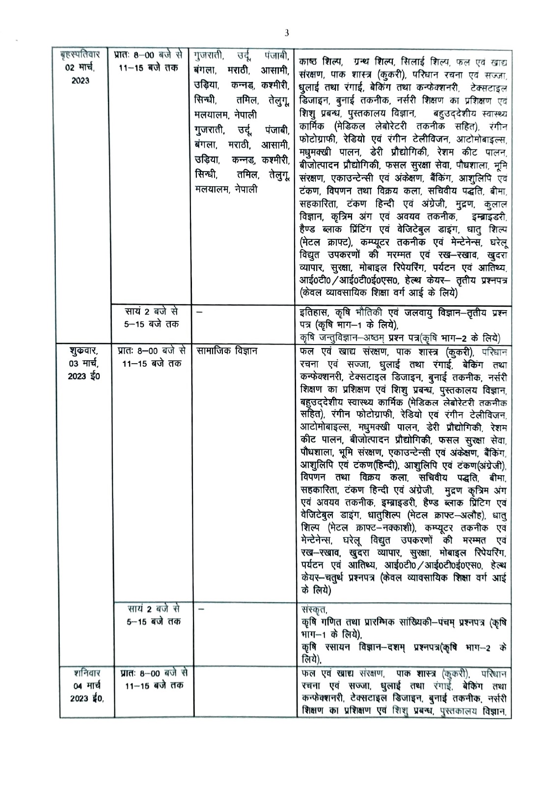 इसी प्रकार, यूपी बोर्ड 10वीं, 12वीं डेटशीट 2023 के अनुसार परीक्षाएं घोषित तारीखों पर दो-दो पालियों में आयोजित की जाएंगी। पहली पाली सुबह 8 बजे से 11.15 बजे तक और दूसरी पाली दोपहर 2 बजे से शाम 5.15 बजे तक चलेगी। परीक्षा के पहले दिन यानि 16 फरवरी को हाई स्कूल के छात्र-छात्राओं के लिए सुबह की पाली में हिंदी और प्रारंभिक हिंदी का प्रश्न-पत्र आयोजित किया जाएगा। वहीं, इंटरमीडिएट के स्टूडेंट्स के लिए सुबह की पाली में सैन्य विज्ञान और दोपहर की पाली में हिंदी व सामान्य हिंदी का पेपर आयोजित किया जाना है।