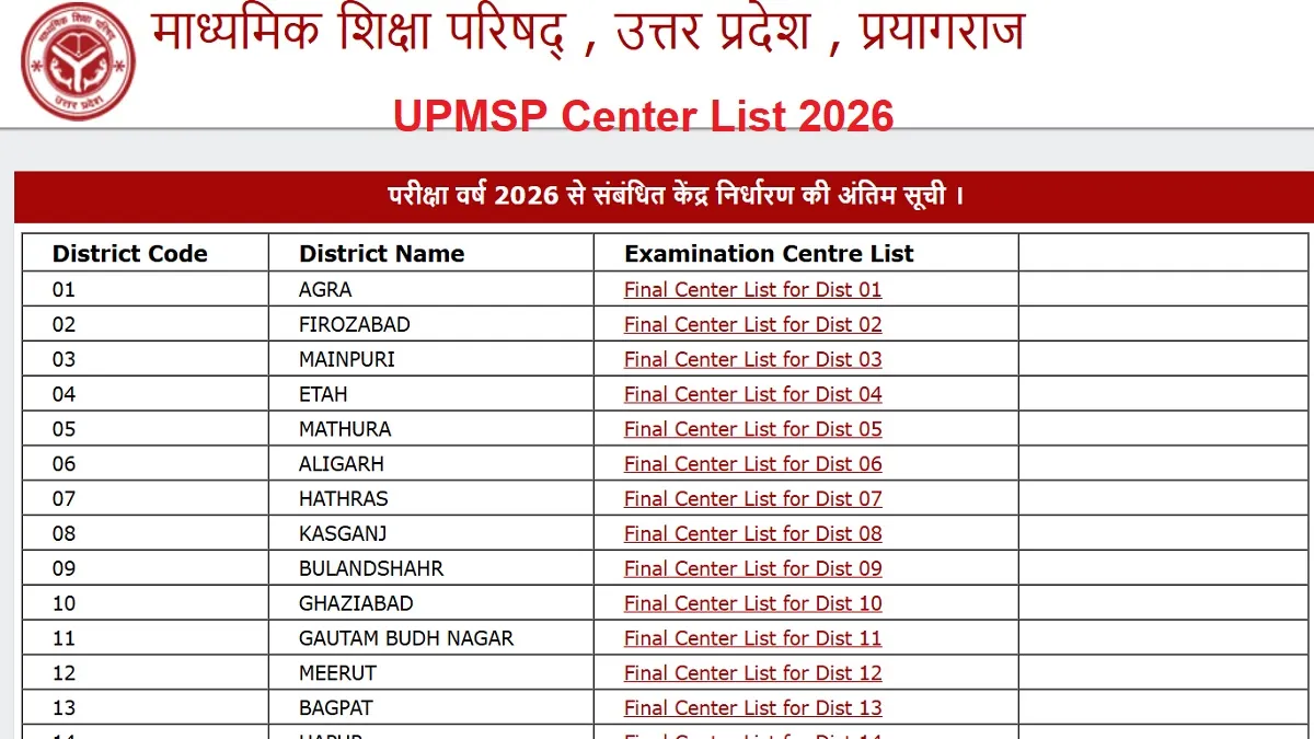 यूपी बोर्ड हाई स्कूल एवं इंटरमीडिएट बोर्ड परीक्षाओं के लिए सेंटर्स की लिस्ट ऑनलाइन माध्यम से UPMSP की ऑफिशियल वेबसाइट upmsp.edu.in पर जारी हुई है। छात्र, अविभावक या टीचर्स केंद्र की जानकारी जिले के अनुसार नीचे दिए जा रहे डायरेक्ट लिंक से चेक कर सकते हैं।