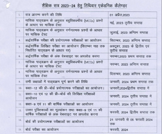 प्रायोगिक परीक्षाओं के बाद यूपी बोर्ड हाई स्कूल और इंटरमीडिएट की परीक्षाओं का आयोजन फरवरी 2023 माह के दौरान करेगा। हालांकि, इससे पहले परिषद ने सभी विद्यालयों को पंजीकृत कक्षा 12 के स्टूडेंट्स के लिए प्री-बोर्ड प्रैक्टिकल का आयोजन जनवरी के दूसरे सप्ताह में और कक्षा 10 व कक्षा 12 के प्री-बोर्ड थ्योरी एग्जाम जनवरी 2024 के तीसरे सप्ताह के दौरान किया जाएगा। दूसरी तरफ, वार्षिक कार्यक्रम के मुताबिक कक्षा 9 और कक्षा 11 की वार्षिक परीक्षाएं जनवरी में ही तीसरे सप्ताह में आयोजित कर ली जाएंगी और रिजल्ट की घोषणा व मार्कशीट का वितरण मार्च 2024 में होगा।