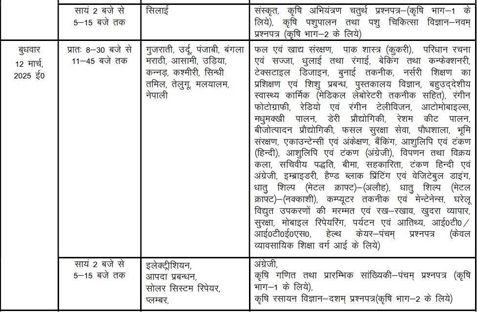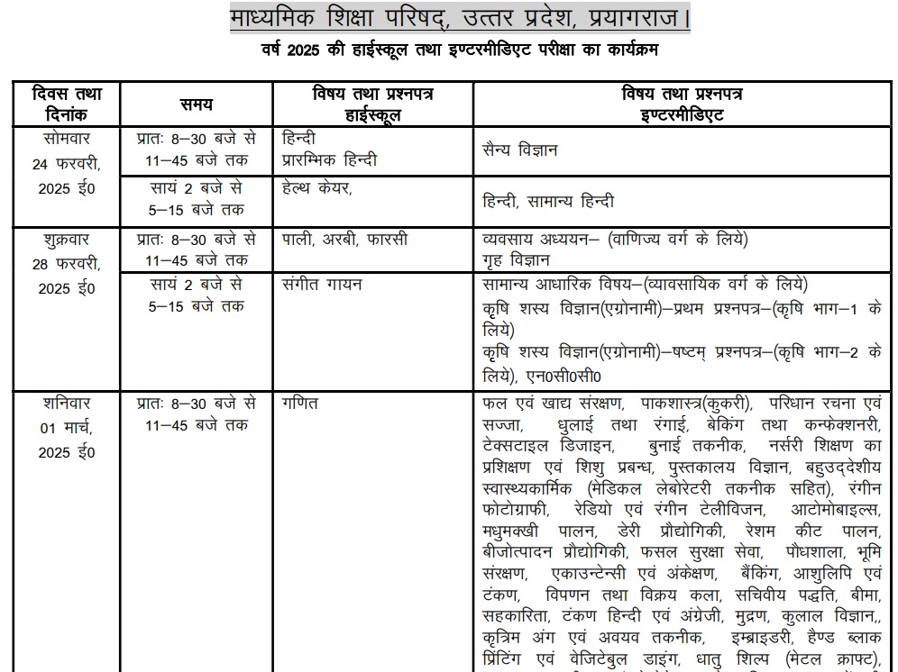एजुकेशन डेस्क, नई दिल्ली। यूपी बोर्ड ने वर्ष 2025 की हाईस्कूल एवं इंटरमीडिएट परीक्षा की तिथि घोषित कर दी है। बोर्ड सचिव भगवती सिंह ने बताया कि हाईस्कूल एवं इंटरमीडिएट की परीक्षा एक साथ 24 फरवरी से शुरू होकर 12 मार्च को संपन्न होंगी। परीक्षा में 54,38,597 छात्र-छात्राएं सम्मिलित होंगे। जो भी अभ्यर्थी बोर्ड परीक्षाओं में शामिल होने जा रहे हैं वे टाइम टेबल माध्यमिक शिक्षा परिषद्, उत्तर प्रदेश की ऑफिशियल वेबसाइट upmsp.edu.in पर जाकर डाउनलोड कर सकते हैं। इसके साथ ही आप इस पेज पर दी गई टेबल से भी 10वीं एवं 12वीं कक्षा का टाइम टेबल विषय एवं तिथि के अनुसार चेक कर सकते हैं।
