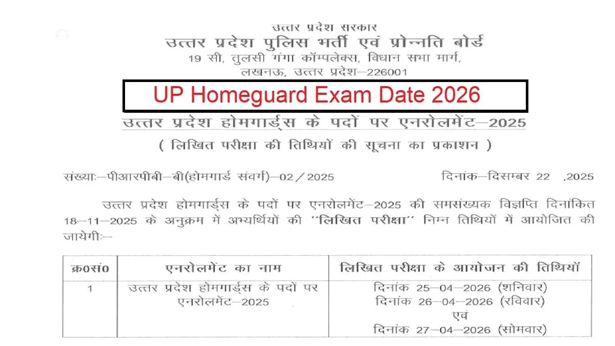 बोर्ड की ओर से जारी नोटिफिकेशन के मुताबिक उत्तर प्रदेश होमगार्ड भर्ती 2025 के लिए परीक्षा का आयोजन (UP Homeguard Exam Kab Hoga) 25, 26 एवं 27 अप्रैल 2026 को करवाया जायेगा।