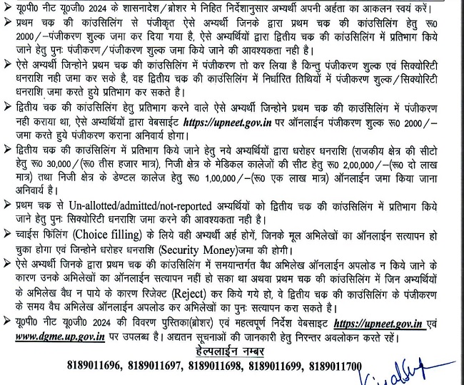 एजुकेशन डेस्क, नई दिल्ली। कार्यालय महानिदेशक, चिकित्सा शिक्षा एवं प्रशिक्षण, उत्तर प्रदेश, लखनऊ की ओर से यूपी नीट यूजी 2024 पहले चरण की काउंसिलिंग पूरी होने के बाद अब 2nd राउंड काउंसिलिंग के लिए शेड्यूल जारी कर दिया गया है। नोटिफिकेशन के मुताबिक UP NEET Counselling Round 2 में शामिल होने के लिए रजिस्ट्रेशन 9 सितंबर से शुरू किये जाएंगे। पंजीकरण ऑनलाइन माध्यम से ऑफिशियल वेबसाइट upneet.gov.in पर जाकर किया जा सकेगा। रजिस्ट्रेशन एवं अभिलेख अपलोड करने की लास्ट डेट 13 सितंबर 2024 तय की गई है।
