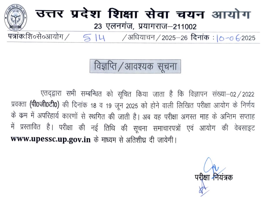 एजुकेशन डेस्क, नई दिल्ली। उत्तर प्रदेश शिक्षा सेवा चयन आयोग (UPESSC) की ओर से 18 एवं 19 जून 2025 को प्रवक्ता पीजीटी (विज्ञापन संख्या 2/2022) की लिखित परीक्षा आयोजित की जाने वाली थी जिसे अब अपरिहार्य कारणों के चलते स्थगित कर दिया गया है। आयोग की ओर से यह जानकारी ऑफिशियल वेबसाइट upessc.up.gov.in पर नोटिफिकेशन जारी कर साझा की गई है।