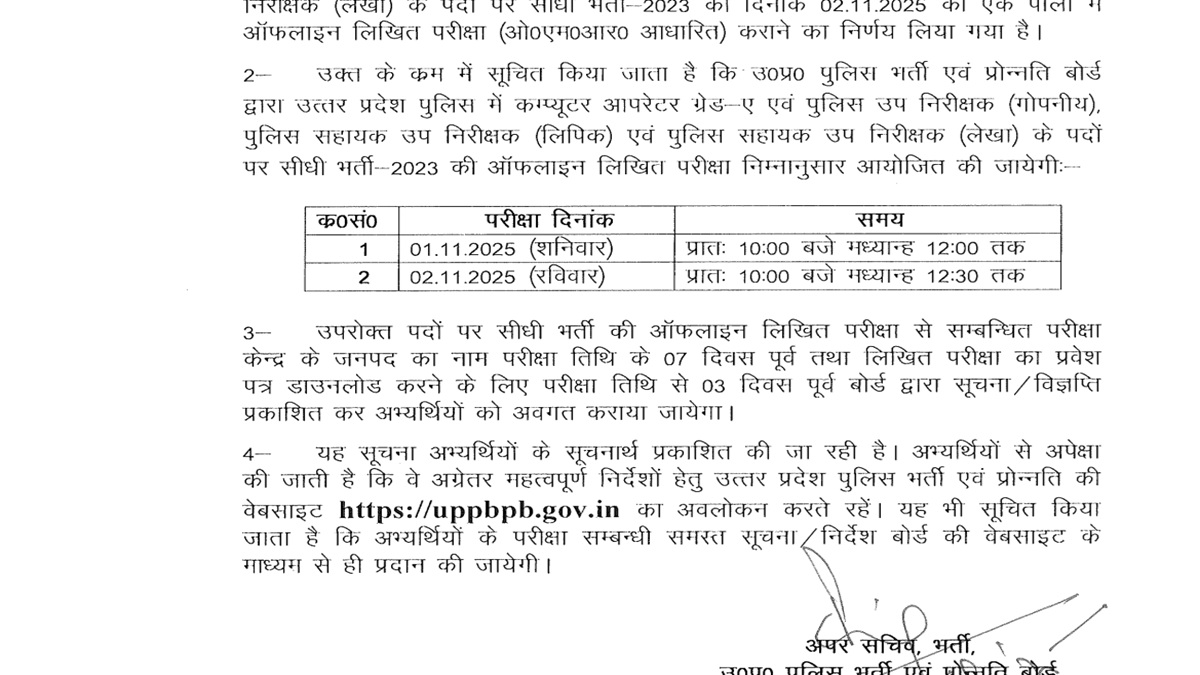 उत्तर प्रदेश पुलिस भर्ती एवं प्रोन्नति बोर्ड की ओर से कंप्यूटर ऑपरेटर सहित अन्य पदों के लिए परीक्षा देशभर के विभिन्न परीक्षा केंद्रों में 01 और 02 नंवबर, 2025 को आयोजित कराई जाएगी। यह परीक्षा केवल एक पाली में सुबह 10 बजे से लेकर 12 बजे तक आयोजित कराई जाएगी।