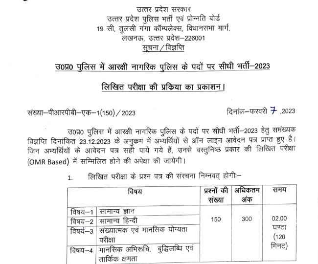 इसके साथ ही UPPRPB द्वारा जारी विज्ञप्ति के मुताबिक लिखित परीक्षा में विभिन्न विषयों से कुल 150 प्रश्न पूछे जाएंगे, जिनके लिए कुल 300 अधिकतम अंक निर्धारित होंगे। परीक्षा की अवधि 2 घंटे (120 मिनट) होगी, जिसके भीतर उम्मीदवारों को सभी प्रश्न हल करने होंगे।