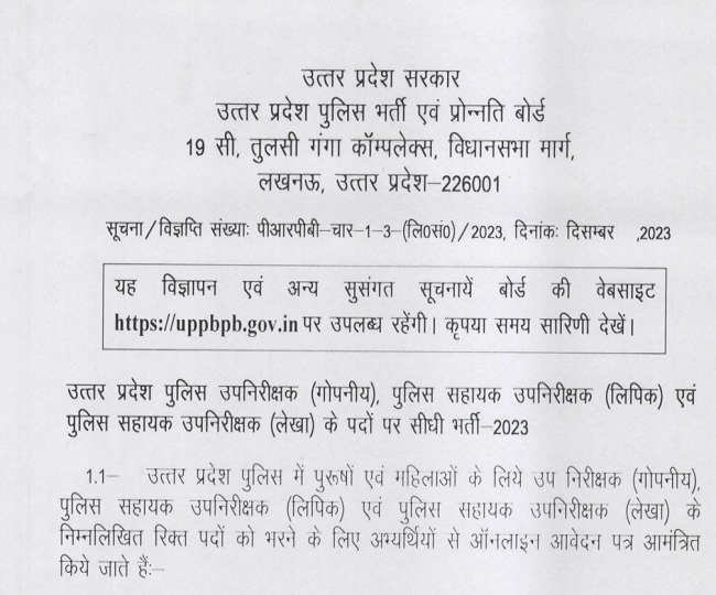 UP Police SI Bharti 2023: यूपी पुलिस एसआई भर्ती के लिए नोटिफिकेशन जारी, 7 जनवरी से शुरू होंगे आवेदन