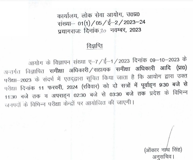 UPPSC ने इससे पहले रिव्यू ऑफिसर / असिस्टेंट रिव्यू ऑफिसर लिखित परीक्षा की तिथि का ऐलान किया था। आयोग के आधिकारिक नोटिस के अनुसार परीक्षा का आयोजन 11 फरवरी 2024 को किया जाना है। परीक्षा 2-2 घंटों की दो पालियों में आयोजित की जाएगी, जो कि सुबह 9.30 बजे और दोपहर 2.30 बजे शुरू होंगी। परीक्षा में सम्मिलित होने के लिए जरूरी निर्देश उम्मीदवार प्रवेश पत्र (UPPSC RO/ARO Admit Card 2023) के साथ-साथ परीक्षा अधिसूचना में देख सकते हैं।