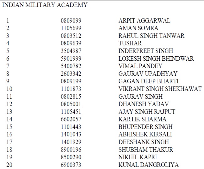 यूपीएससी द्वारा चयनित उम्मीदवारों की सूची में अर्पित अग्रवाल (रोल नंबर 0809099) ने पहला स्थान प्राप्त किया है। इनके बाद अमन सोमरा (रोल नंबर 1105699) ने दूसरा और राहुल सिंह तनवर (रोल नंबर 0803512) ने तीसरा स्थान प्राप्त किया है। टॉप उम्मीदवारों की लिस्ट नीचे दी गई है:-