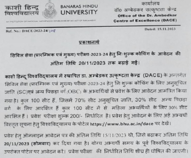 एजुकेशन डेस्क, नई दिल्ली। UPSC Free Coaching BHU: काशी हिन्दू विश्वविद्यालय यानी कि बीएचयू की ओर से सिविल सेवा परीक्षा 2023-24 (प्रारंभिक एवं मुख्य) की फ्री कोचिंग करवाई जाती है। इसके लिए उम्मीदवारों को एंट्रेस एग्जाम में भाग लेना होता है। ऐसे अभ्यर्थी जो बीएचयू से यूपीएससी की फ्री कोचिंग करना चाहते हैं वे आज यानी 20 नवंबर 2023 तक ऑनलाइन माध्यम से आवेदन पत्र भर सकते हैं। आज के बाद एप्लीकेशन विंडो क्लोज कर दी जाएगी। एप्लीकेशन फॉर्म ऑफिशियल वेबसाइट www.bhu.ac.in/dace पर जाकर उपलब्ध है जहां से आवेदन प्रक्रिया पूर्ण की जा सकती है।