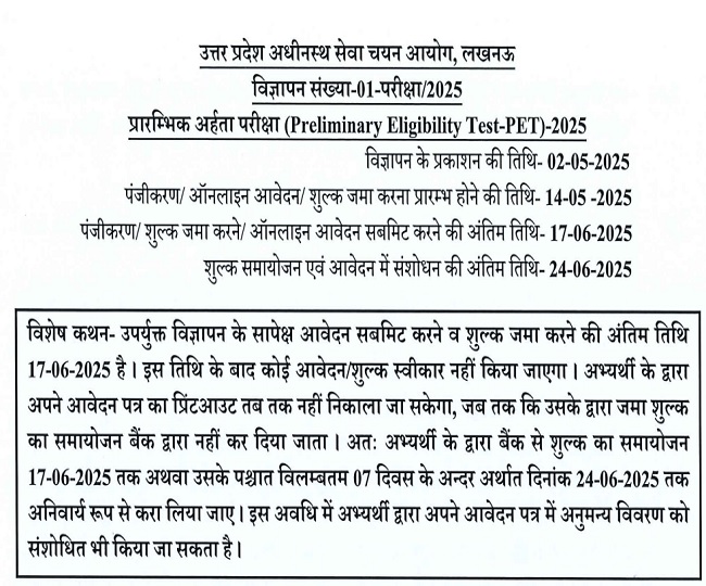 UPSSSC PET 2025: उत्तर प्रदेश प्रारंभिक अर्हता परीक्षा के लिए नोटिफिकेशन जारी, आवेदन 14 मई से होंगे स्टार्ट
