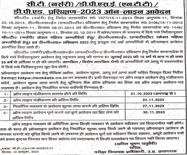 एजुकेशन डेस्क, नई दिल्ली। CT Nursery NTT DPSE and DPEd Training: सचिव परीक्षा नियामक प्राधिकारी, उत्तर प्रदेश की ओर से सीटी (नर्सरी), डीपीएसई (एनटीटी), डीपीएड प्रशिक्षण 2023 के लिए नोटिफिकेशन जारी कर ऑनलाइन आवेदन प्रक्रिया शुरू कर दी गयी है। ऐसे अभ्यर्थी जो इस ट्रेनिंग एग्जाम में शामिल होना चाहते हैं वे तुरंत ही विभाग की ऑफिशियल वेबसाइट entdata.co.in पर जाकर या इस पेज पर दिए गए डायरेक्ट लिंक के माध्यम से फॉर्म भर सकते हैं। ऑनलाइन एप्लीकेशन फॉर्म भरने की अंतिम तिथि 24 नवंबर 2023 निर्धारित की गयी है। आवेदन करने से पहले अभ्यर्थी निर्धारित योग्यता अवश्य चेक कर लें।
