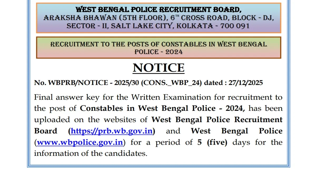WBP Constable Final Answer Key 2025: वेस्ट बंगाल पुलिस कॉन्स्टेबल फाइनल आसंर-की जारी, रिजल्ट जल्द आने की उम्मीद