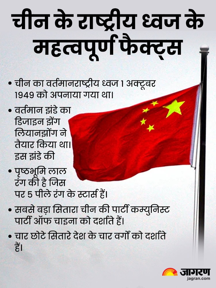 एजुकेशन डेस्क, नई दिल्ली। किसी भी देश के राष्ट्रीय ध्वज (National Flag) से विश्वभर में उसकी पहचान होती है। हर देश के झंडे में कुछ विशेष होता है। चीन (पीपल्स रिपब्लिक ऑफ चाइना) का वर्तमान राष्ट्रीय ध्वज को 1949 में अपनाया गया था। यह एक लाल पृष्ठभूमि वाला झंडा है जिस पर पांच पीले सितारों को जगह दी गई है. यह सितारे साम्यवाद का प्रतीक हैं। इसमें से एक सबसे बड़ा स्टार कम्युनिस्ट पार्टी ऑफ चाइना का प्रतिनिधित्व करता है वहीं बाकी के 4 स्टार्स चीनी लोगों के चार वर्गों- किसानों, श्रमिकों, बुद्धिजीवियों और उद्यमियों का प्रतिनिधित्व करते हैं।