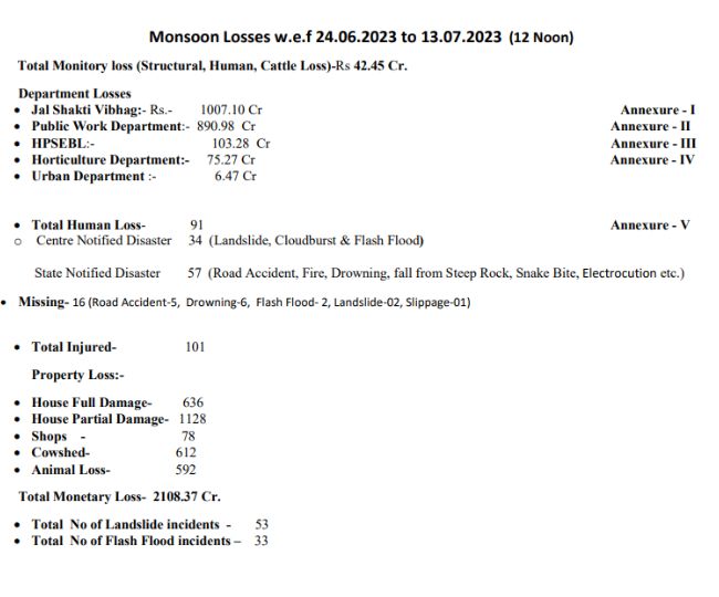 91 people lost their lives in Himachal Pradesh from June 24 to July 13.