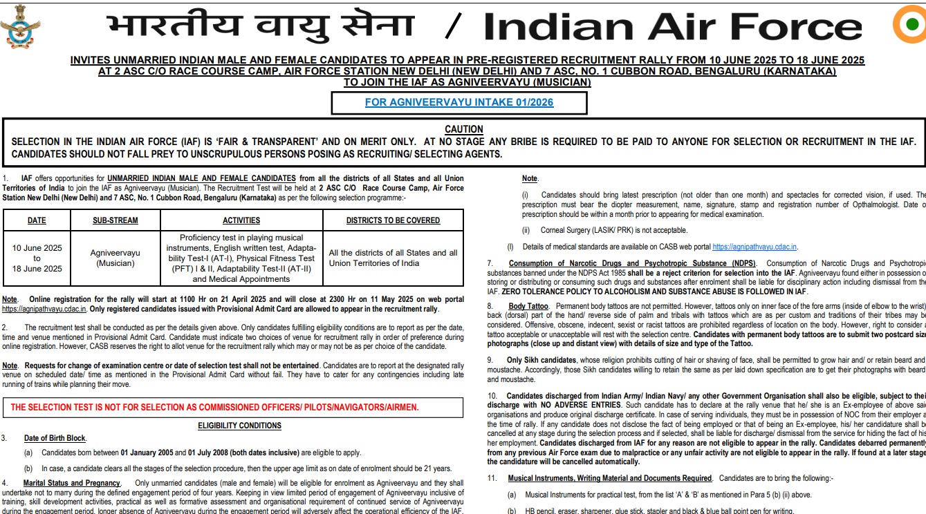 IAF Agniveervayu Recruitment 2025: इंडियन एयरफोर्स अग्निवीर म्यूजिशियन पदों पर आवेदन स्टार्ट, 10 से 18 जून तक होगी रैली भर्ती