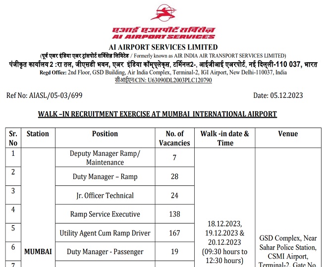 AIASL Recruitment 2023: एआईएएसएल में विभिन्न पदों पर निकली भर्ती, बिना परीक्षा के होगी नियुक्ति