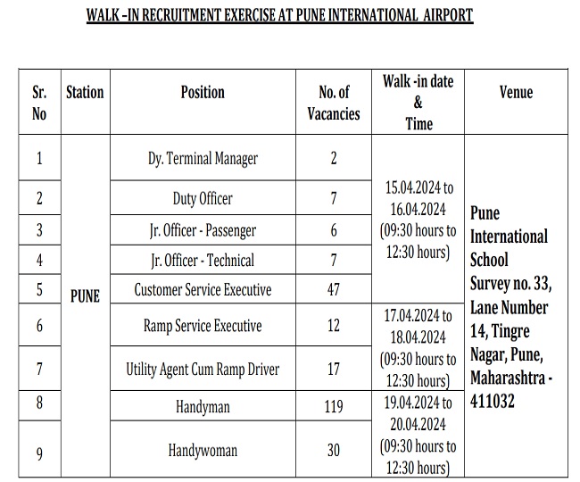 इंटरव्यू की टाइमिंग सुबह 9:30 बजे से दोपहर 12:30 बजे तक किया जाएगा। इंटरव्यू के लिए उम्मीदवारों को पुणे अंतरराष्ट्रीय विद्यालय सर्वे नं. 33, लेन नंबर 14, टिंगरे नगर, पुणे, महाराष्ट्र - 411032 पर उपस्थित होना होगा।