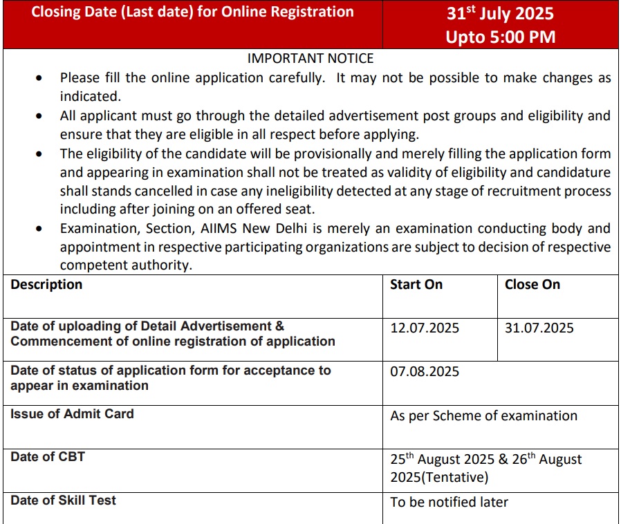 AIIMS CRE Vacancy 2025: एम्स कॉमन रिक्रूटमेंट एग्जाम के लिए आवेदन की लास्ट डेट आज, तुरंत कर लें अप्लाई