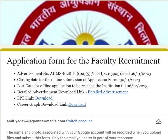 AIIMS Bilaspur Recruitment 2023 ऑल इंडिया इंस्टीट्यूट ऑफ मेडिकल साइंसेज बिलासपुर की ओर से प्रोफेसर एसोशिएट प्रोफेसर पदों पर भर्ती चल रही है। इस भर्ती में शामिल होने के लिए उम्मीदवार 30 नवंबर 2023 तक ऑनलाइन माध्यम से गूगल लिंक के माध्यम से आवेदन कर सकते हैं। फॉर्म की हार्ड कॉपी भेजने की अंतिम तिथि 6 दिसंबर 2023 तय की गयी है।