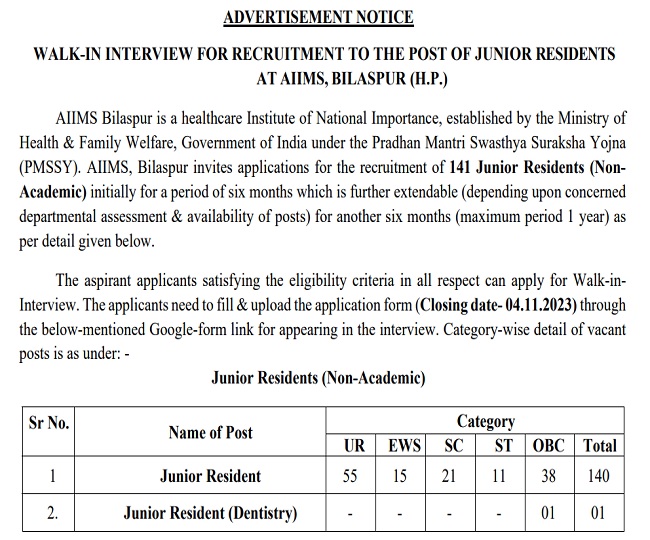 AIIMS Bilaspur Recruitment 2023 ऑल इंडिया इंस्टीट्यूट ऑफ मेडिकल साइंसेज बिलासपुर की ओर से जूनियर रेजिडेंट के पदों पर भर्ती निकाली गयी है। इस भर्ती में शामिल होने के लिए उम्मीदवार निर्धारित अंतिम तिथि 4 नवंबर 2023 तक एप्लीकेशन फॉर्म भर सकते हैं। इस भर्ती के माध्यम से एम्स बिलासपुर में जूनियर रेजिडेंट के 141 रिक्त पदों पर नियुक्तियां की जाएंगी।
