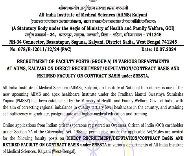 AIIMS Recruitment 2024: एम्स कल्याणी में फैकल्टी पदों पर हो रही भर्ती, ऑनलाइन माध्यम से कर सकते हैं अप्लाई