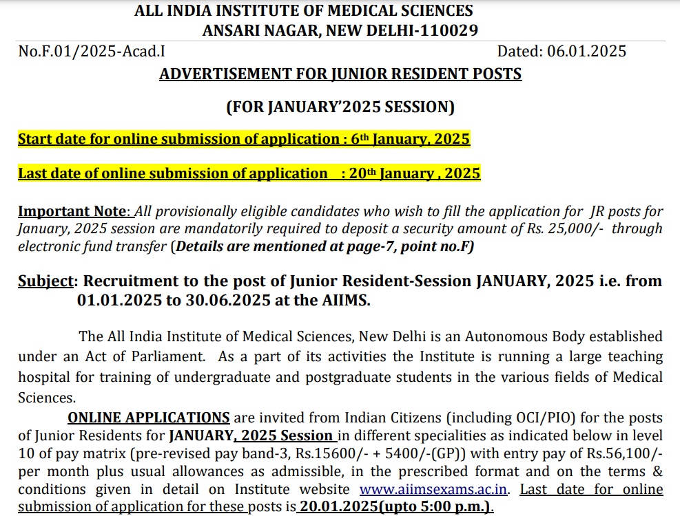 जॉब डेस्क, नई दिल्ली। ऑल इंडिया इंस्टीट्यूट ऑफ मेडिकल साइंस (AIIMS) दिल्ली की ओर से जूनियर रेजिडेंट के रिक्त पदों पर भर्ती निकाली गई गई है। इस भर्ती के लिए आवेदन प्रक्रिया 6 जनवरी 2025 से शुरू कर दी गई है। जूनियर रेजिडेंट पदों के लिए योग्यता पूरी करने वाले अभ्यर्थी भर्ती में शामिल होने के लिए ऑनलाइन माध्यम से एम्स की ऑफिशियल वेबसाइट aiimsexams.ac.in पर जाकर या इस पेज पर दिए डायरेक्ट लिंक से फॉर्म भर सकते हैं। एप्लीकेशन फॉर्म भरने की लास्ट डेट 20 जनवरी 2025 सायं 5 बजे तक निर्धारित की गई है।