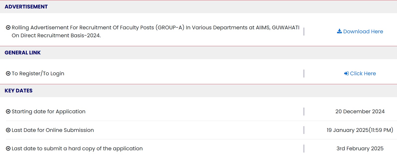- इस भर्ती में आवेदन के लिए सबसे पहले आधिकारिक वेबसाइट aiimsguwahati.ac.in पर विजिट करें।