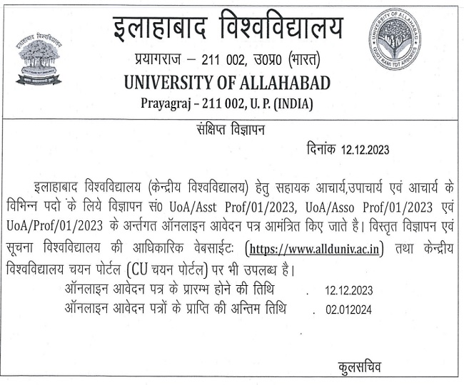 Allahabad University Recruitment 2024: इलाहाबाद विश्वविद्यालय में टीचिंग पदों की भर्ती के लिए आवेदन शुरू